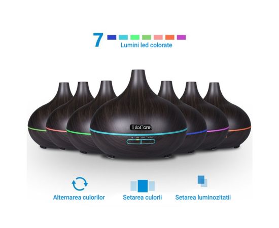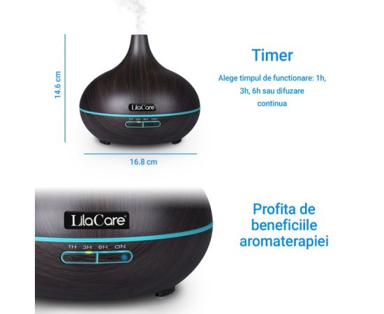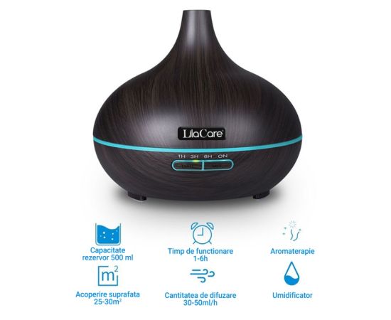Umidificator difuzor aromaterapie, Lila Care, 500 ml, ultrasonic, cu telecomanda, Lemn stejar