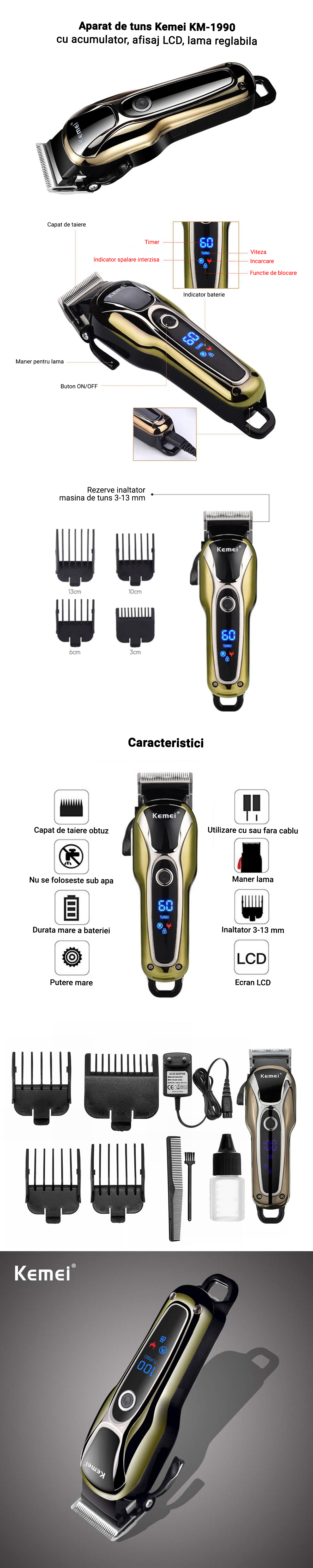 Aparatul de tuns Kemei KM - 1990 - cu performante ridicate este potrivit oricarui stil, oferind calitate si precizie.