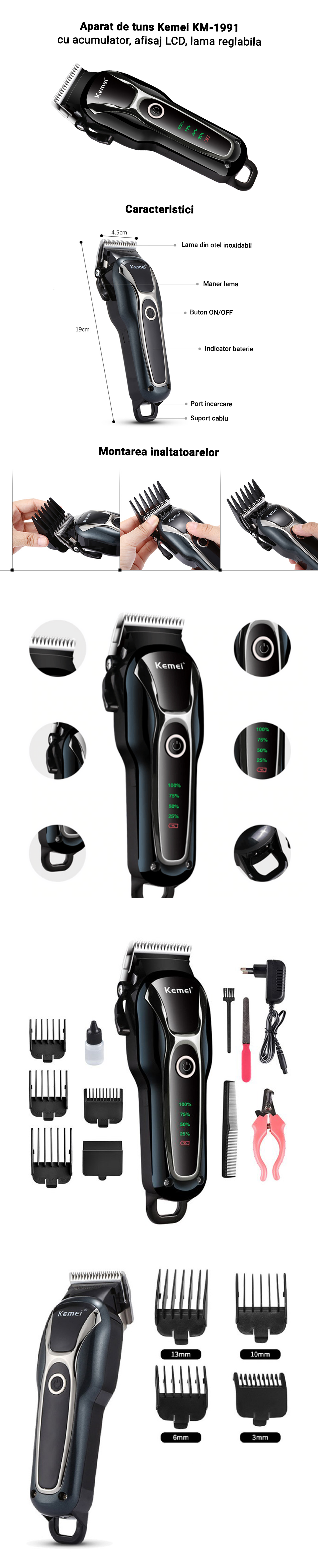 Masina de tuns pentru animale Kemei, KM-1991, cu acumulator, afisaj LCD, lama reglabila